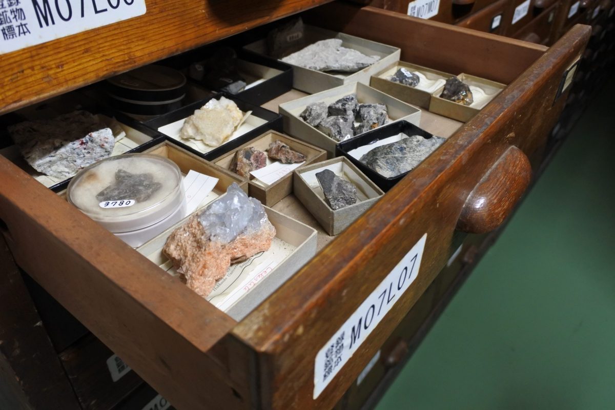 *Photo on the left : Drawers, drawers and more drawers containing a collection of stones arranged by category. In this room you can only feel the past history of the Hokkaido University.