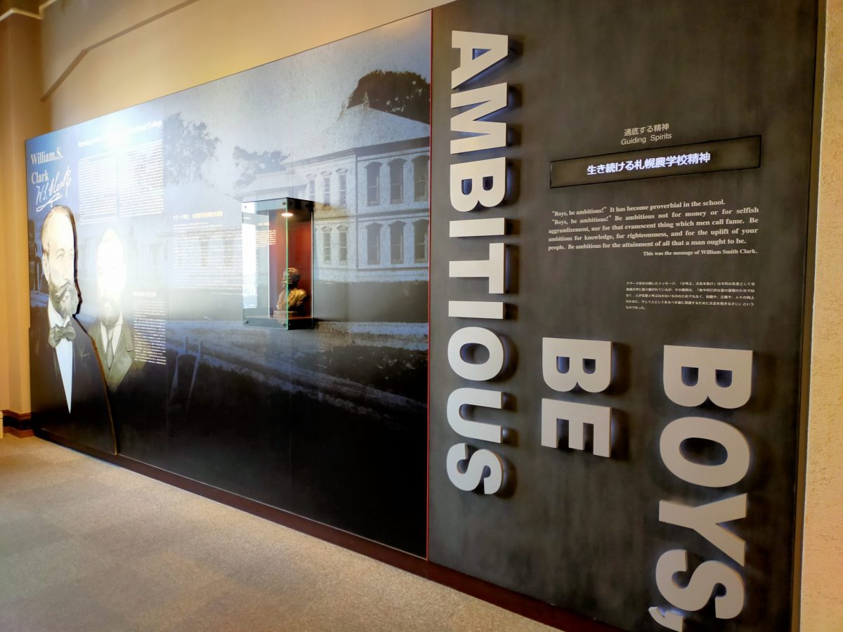 So, in 1876, Sapporo Agricultural College built on the model of Agricultural College Massachusetts College (MAC), of which William Smith Clark was president from 1867 to 1879, welcomed 24 students and William S. Clark was its first vice-president. Clark remained in Hokkaido for only eight and half months but he contributed greatly to the development of Sapporo through the advice he gave not only to the Sapporo Agricultural College but also to the government. He introduced the first American model farm and barn in Japan and the first college military unit in the country. He also introduced new crops and new techniques in agriculture, fishing, and animal husbandry. He not only had a significant impact on the scientific and economic colonial development of the island but also on his students who became leaders of Hokkaido or nationally in Japan and his name is still well-known in Hokkaido. Upon his departure, Clark looked back at his 24 students and shouted “Boys be ambitious !” {“Boys, be ambitious! Be ambitious not for money or for selfish aggrandizement, not for that evanescent thing which men call fame. Be ambitious for that attainment of all that a man ought to be.”} and it is now the motto of the University.