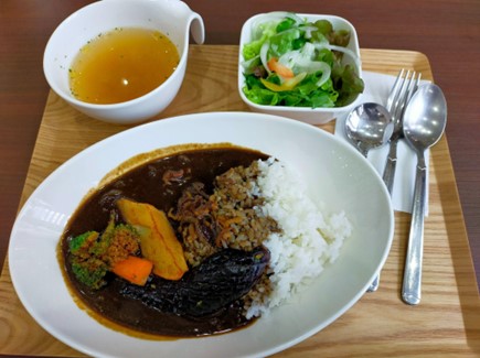 Before starting our private campus tour of Hokkaido University, we had lunch at Gohan’s Café. Located in the same building as the Hokkaido Universal Original Shop and Information Point, where you will find many items featuring Dr. Clark, it is a small café with large windows, bright and open to nature. It is open from 7:45am to 10:30pm and serves affordable food that differs depending on the time of day. I salivated at the breakfast menu, with some very appetizing dishes, and I will definitely come back to try their eggs Benedict or, when I feel nostalgic for France, their croissant sandwich. For lunch, I ordered the black curry set but I hesitated for a long time about two other dishes on the menu that also looked very good: the vegetable soup with chicken from Hokkaido University and the special rice set with beef omelet. I really enjoyed the taste of the black curry, a taste that stands out from all the curries I’ve had in Sapporo so far, a taste unique to Hokkaido University.