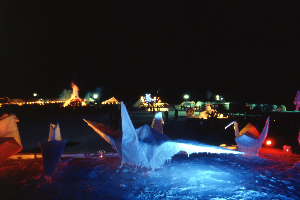 Actually, the most interesting part of the festival starts after the closing fireworks of the festival. After that starts the Human Cold Resistance Test (人間耐寒テスト), in which the test participants spend a night outside in the festival area and sleep in “balloon mansions”. Balloon mansions are spherical ice sculptures with a diameter of 2.5 meters (about 8 feet) and holes on the sides so that people can get in and sleep inside the spheres.