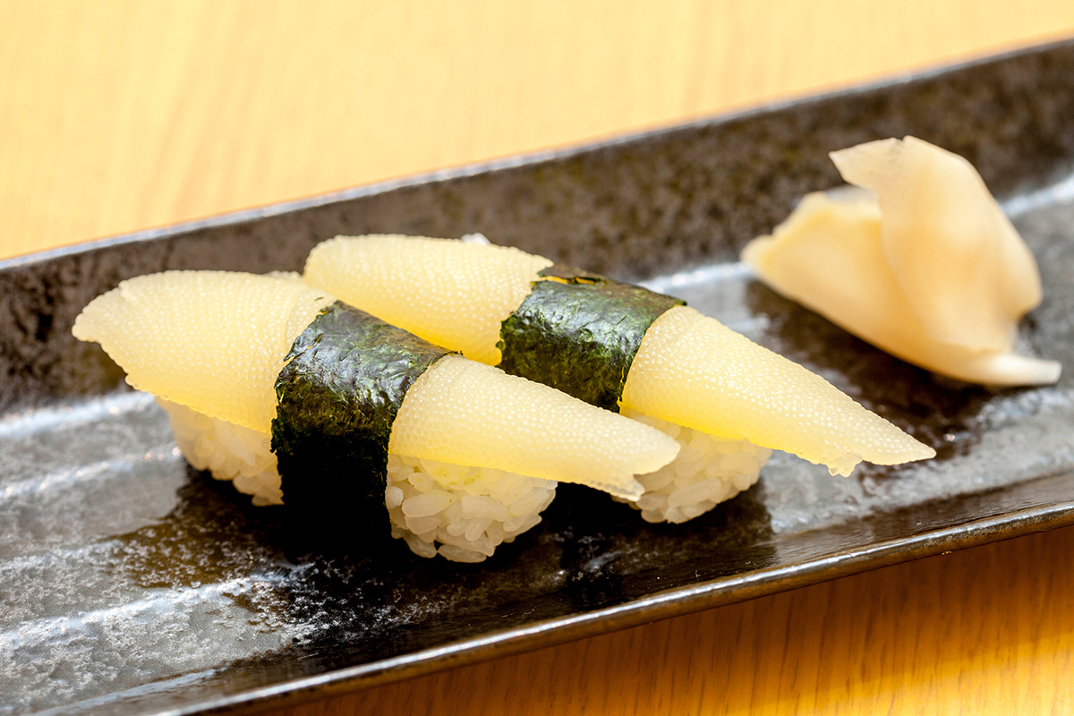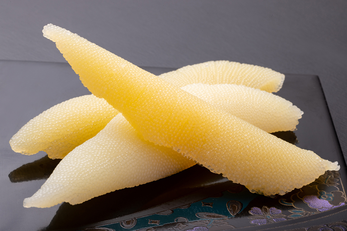 The history of herring and Rumoi doesn’t end there. Even though the herring catch became much smaller, the city remained an important place to process herring, and frozen herring and herring roe was also imported from Russia, Canada, and the US to Rumoi. Rumoi started to specialize in particular to processing herring roe (kazunoko/数の子 or 鯑 in Japanese) and a lot of effort was put into improving the quality of the herring roe using traditional processing methods. Rumoi became the city that produces the highest volumes of salted herring roe (shiokazunoko/塩数の子) in Japan and the city is now especially known for its quality herring roe. The Rumoi herring roe is beautifully yellow and nice and crunchy to eat. Even the city’s cute mascot—Kazumo-chan (KAZUMOちゃん) (an outbound link. The page is in Japanese but there is a machine translation option at top right corner of the page)—is based on the shape of a herring roe!