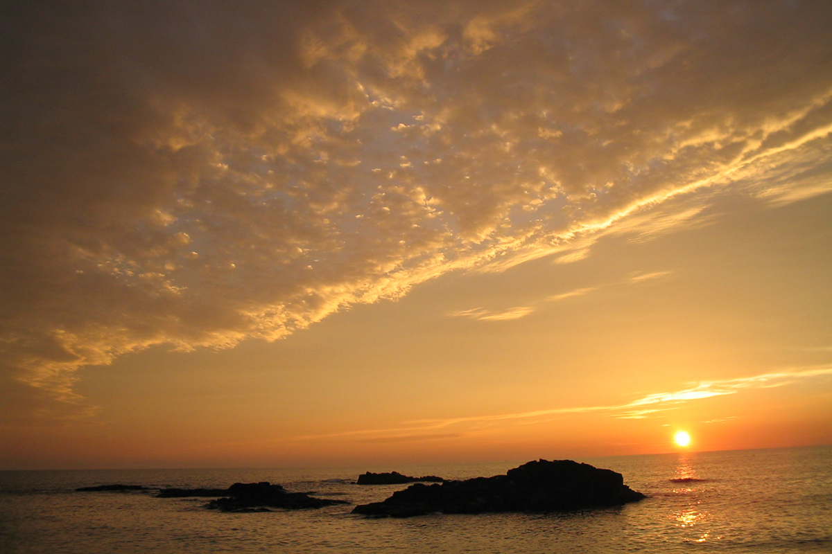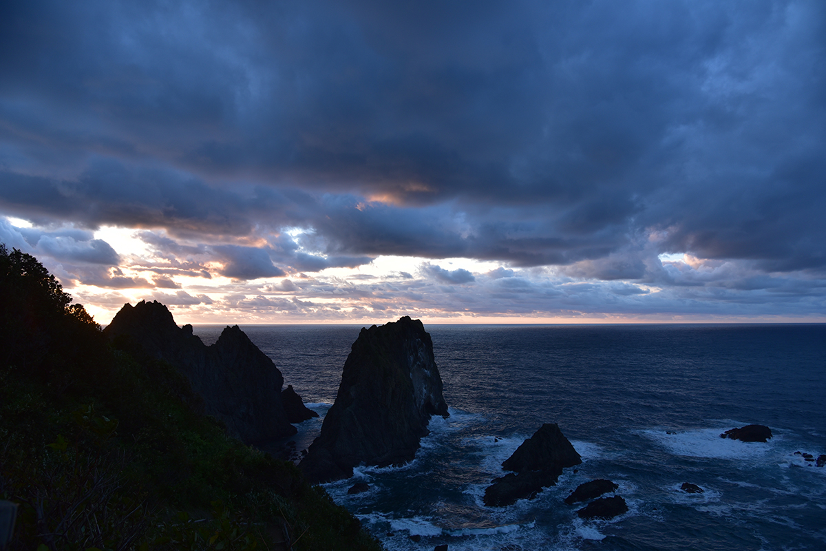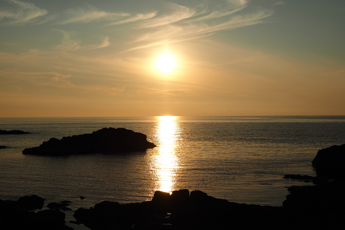One of the best places to view the sunsets in Rumoi is Cape Ogon (Ogon misaki/黄金岬) with its uniquely shaped rocks. There used to be a lookout at Cape Ogon to see where the schools of herring are swimming at the moment. Now the visitors to the cape can pry for the sunsets instead. The Cape Ogon Seaside Park (Ogon misaki kaihin koen/黄金岬海浜公園) built on the cape offers easy to access the best sunsets in whole Japan.
