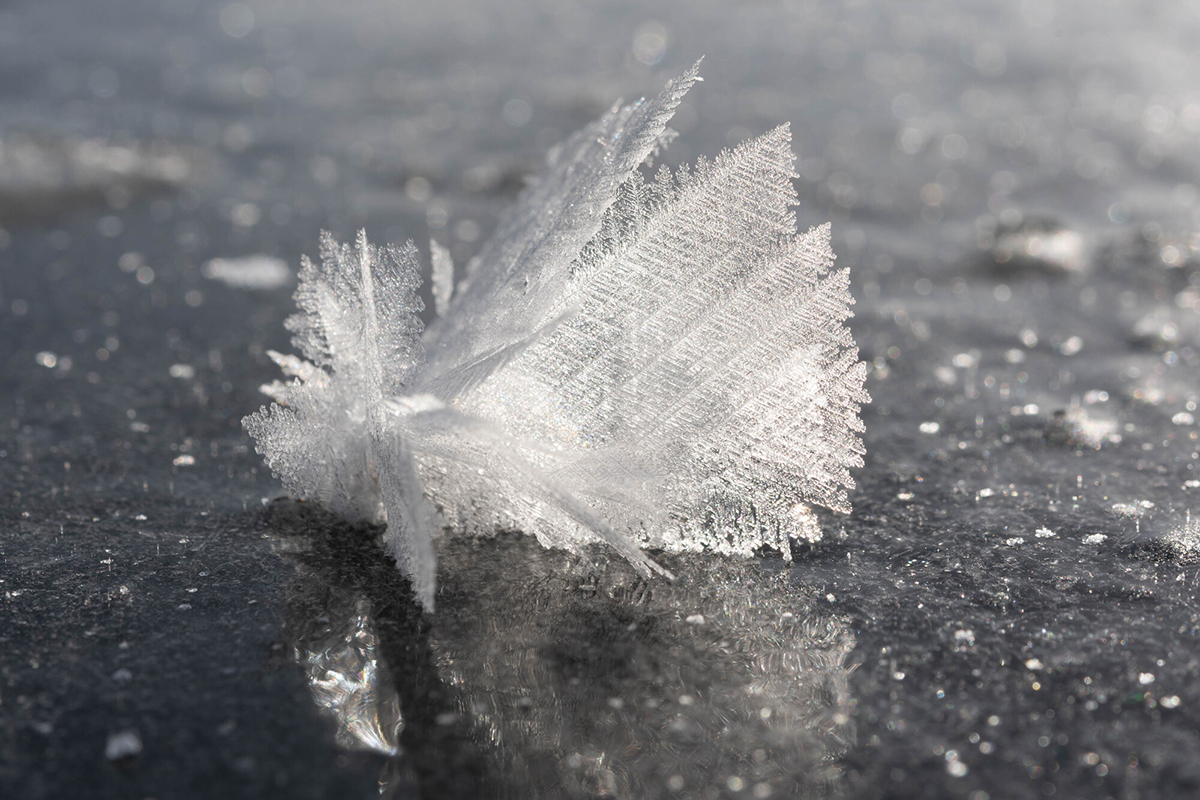 Feather-like ice crystals form in layers, resembling roses, and the sight of them covering the entire lake surface is breathtaking. Sometimes, a single crystal forms, called a “frost wing” or “angel feather.” They are so fragile they melt with just a breath, and are truly art created by nature.