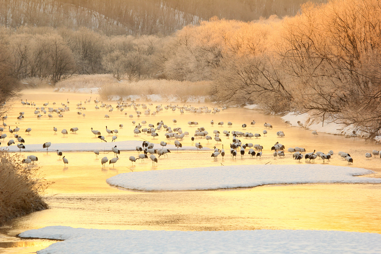 However, dozens of cranes were discovered in the Kushiro Marsh, an area untouched by settlement due to its cold climate and the wet soil, which was difficult to transform into soil suitable for farming. Crane conservation efforts were launched by citizens and the municipal government. Local volunteers continued feeding them during the food-scarce winter months. Thanks to their efforts, the numbers of cranes grew, their habitat expanded, and they have now become a symbol of Kushiro.