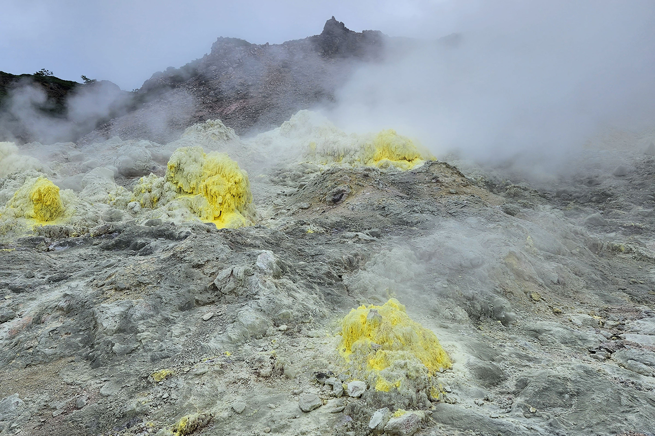 Once prosperous from sulphur mining, this mountain also laid the foundations for the development of the town of Teshikaga via the railway constructed to transport the mined sulphur. Just a few minutes’ walk from the car park brings you right up close to the fumaroles. Experience the dynamic pulse of the Earth firsthand. Nearby are Kawayu Hot Springs, where you can easily enjoy a foot bath.